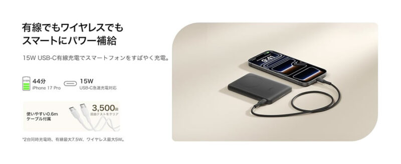 USB-C最大15W出力とワイヤレス最大7.5Wを備え、