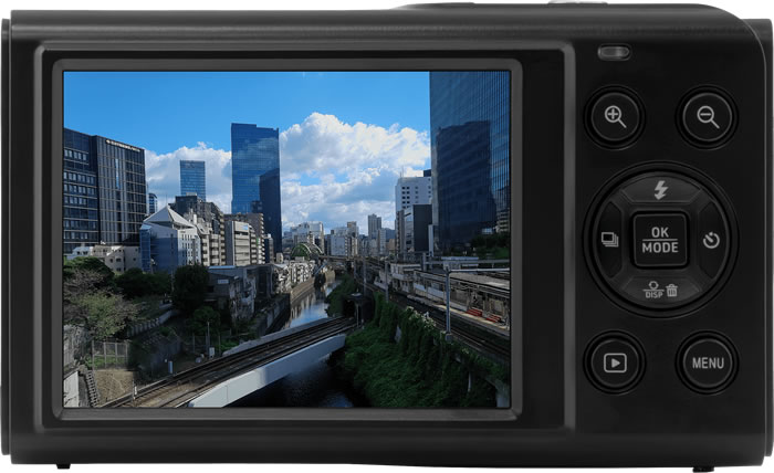 通常、1万円クラスの格安カメラでは液晶は背面のみが一般的です。しかし、本機はレンズの横にしっかりとしたサブモニターを搭載。これにより、レンズを自分に向けた際も、しっかりと構図を確認しながら撮影が可能です。「撮ってみたら顔が半分切れていた」「背景が全然入っていなかった」という、自撮りあるあるの失敗を完全に防げます。