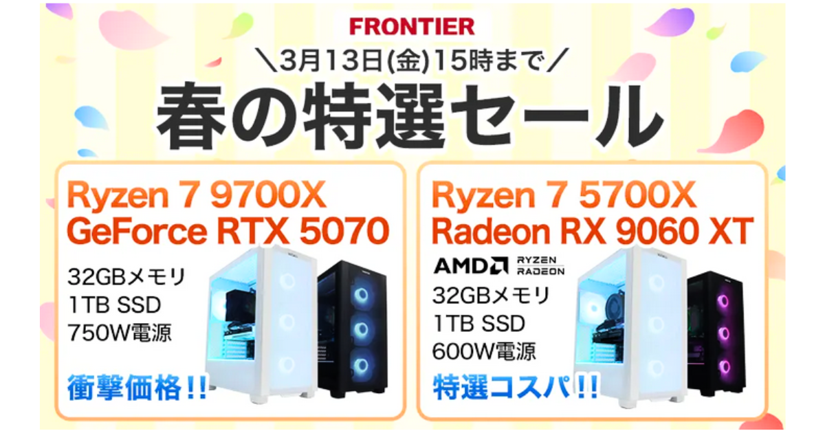 今回のセールはRTX 50シリーズ・Radeon RX 9000シリーズ搭載の最新構成が中心で、16〜70万円超まで幅広く揃う。限定台数モデル(19台・40台)は早期終了の可能性があるため、「用途 → 必要スペック → 候補3台 → 比較」という順番で素早く判断したい。セール終了は3/13(金)15時。