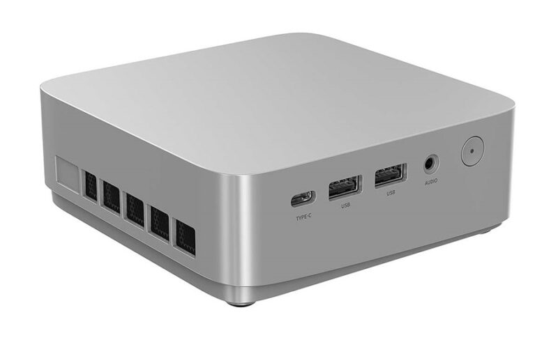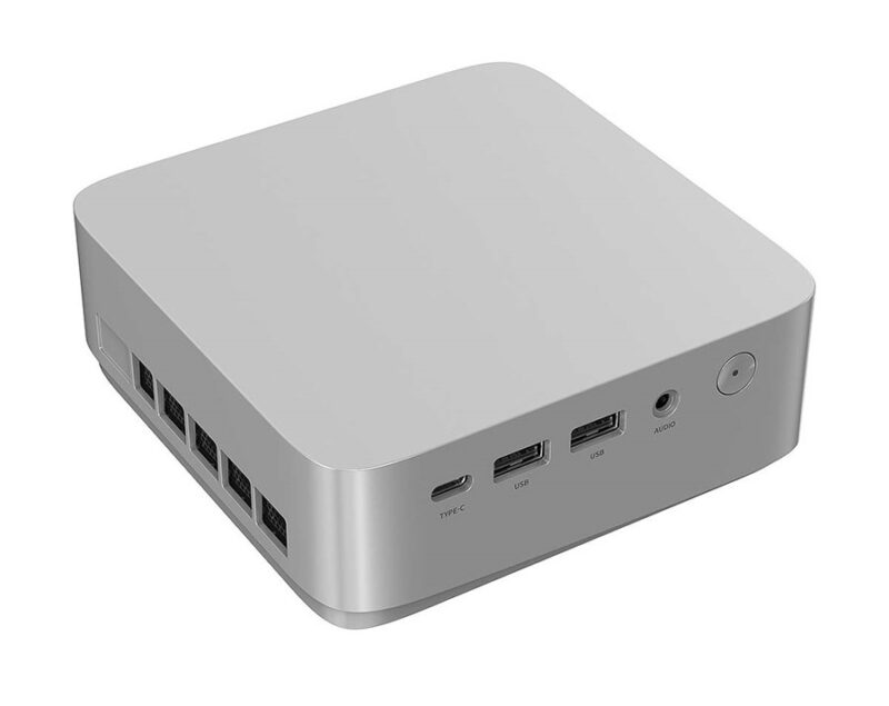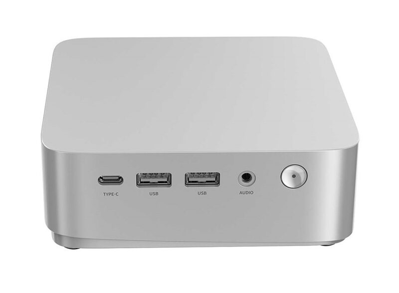 本体サイズは 128(幅)× 128(奥行き)× 45.5(高さ)mm と、まさに手のひらサイズ。デスクの隅に置いても場所を取らず、モニター裏へのVESAマウントにも対応できる設計が嬉しい。ミニPCとしての完成度は高く、シンプルでビジネスライクな外観はオフィスにも自宅にも馴染みやすい。