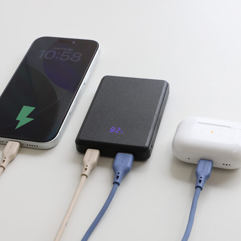USB Type-CポートとUSB Type-Aポートを搭載し、合計最大5V/3A出力で2台の機器を同時に充電できます。スマートフォンとワイヤレスイヤホンなど、2つのデバイスを一度に充電できる便利な仕様です。