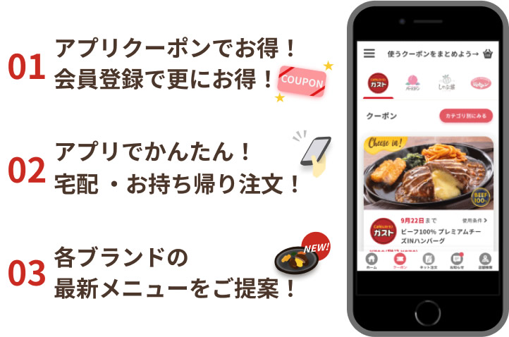 ガストでは、看板メニューの「チーズINハンバーグ」や、大人から子供まで大好きなサイドメニューがクーポン対象になっています。