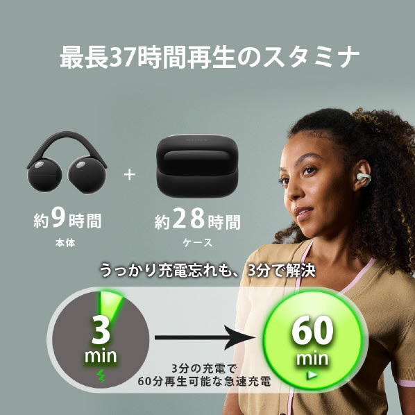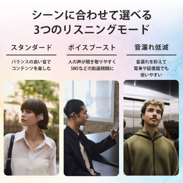 • 運動中も音楽を楽しみたい方: 車の音などが聞こえるため安全性が高く、IPX4の防滴仕様で汗にも強い。