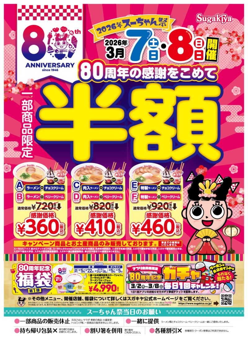 👇3月7日・8日は年に一度の「スガキヤ祭り」!2026年は創業80周年の特別版👇